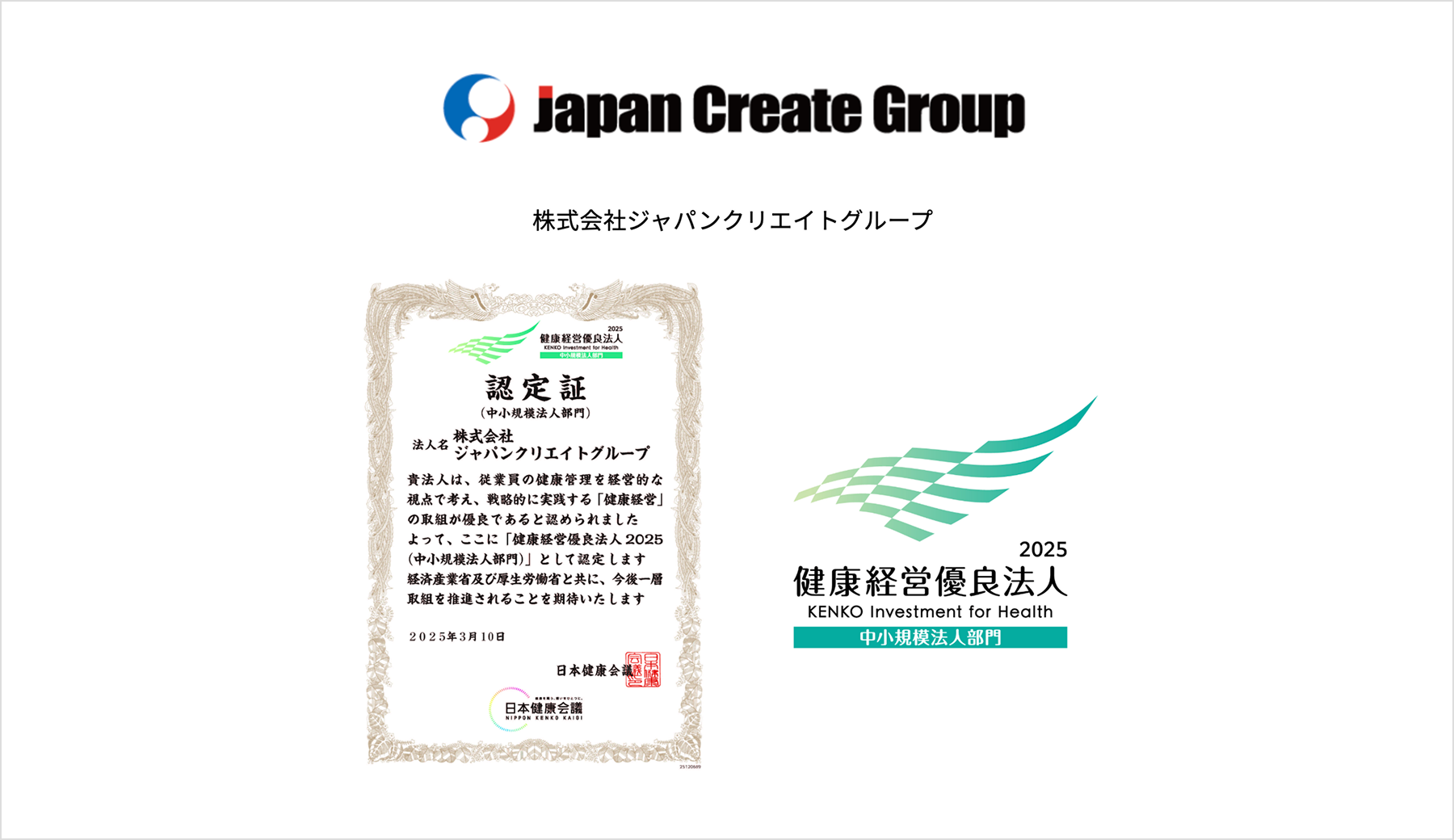 ジャパンクリエイトグループは、経済産業省と日本健康会議が主催する「健康経営優良法人認定制度」において「健康経営優良法人2025(中小規模法人部門)」に認定されました。